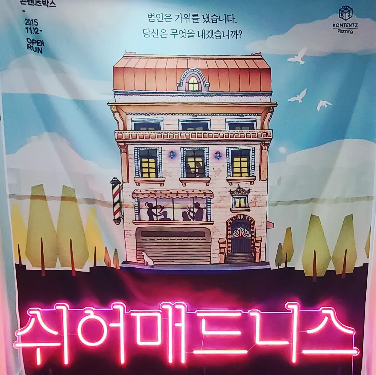 용의자는 총 4명인데 매 공연마다 관객들의 추리에 따라서 범인이 바뀔 수 있는 열린 결말의 연극이었다.
